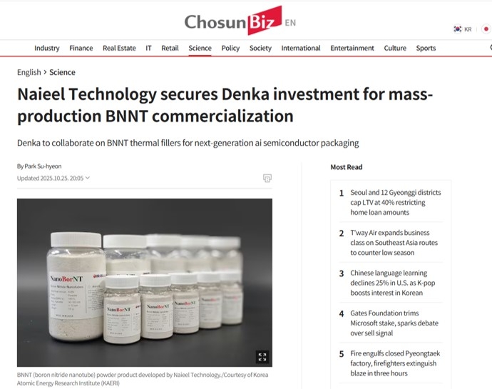 We, naieel technology, recently secured CVC from the Japanese company Denka, one of the most important ceramics manufacturing companies in the world, through US silicon based Pegasus Tech Ventures, to develop and collaborate on the industrial BNNT application technologies. In response to the rapidly growing demand for high thermal conductivity materials in AI servers and semiconductor power modules. Through this investment, we, naieel technology, aims to collaborate with Denka in joint development efforts that combine BNNT with conventional thermal filler technologies, thereby contributing to the realization of next-generation thermal management materials that meet increasingly advanced thermal requirements.