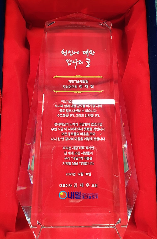 지난 2021년 정제공정 개선에 대한 수고와 노력으로 생산성 향상에 크게 공헌한 정재혁 주임연구원에게 감사패를 전달하였습니다.