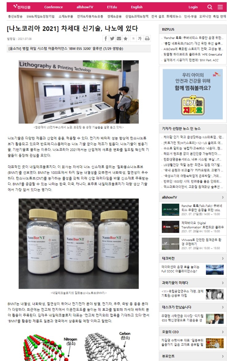 We had received huge attentions from the various industries from IT to energy/environment because of the excellent material properties of BNNT and also its promising industrial applications. Due to the excellent natures of BNNT, naieel technology and BNNT were introduced at the ET NEWS(전자신문), one of the most read newspaper in the industrial sectors of South Korea, as s solution provider and a game changer for next generation.
