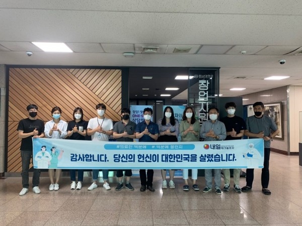 내일테크놀로지에서는 7월6일 코로나19 확산 예방과 감염 치료를 위해 의료 최전선에서 헌신하고 있는 전국 의료진에게 감사와 응원의 메시지를 전달하는 ‘덕분에 챌린지’ 캠페인에 동참했습니다. 릴레이 형식으로 진행되는 이 캠페인에 충남대 LINC+사업단으로부터 지목을 받아 참여하게 되었으며, 다음 주자로 (주)액트너랩을 지목하여 이어나갈 계획입니다.