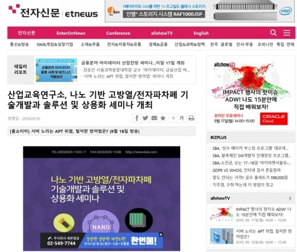 산업교육연구소는 9월 20~21일 서울 여의도 사학연금회관에서 “나노 기반 고방열/전자파차폐 기술개발과 솔루션 및 상용화 세미나”를 개최합니다.