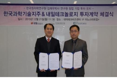내일테크놀로지는 KST에서 3억원, 민간투자자로부터 4000만원의 투자를 받았다. 내일테크놀로지는 한국원자력연구원 김재우 박사팀이 국내 최초로 개발한 질화붕소나노튜브(BNNT)의 대량제조기술을 상용화한 기업이다. BNNT를 응용해 원자력·우주산업·IT산업 관련제품을 개발한다.▲ 조남훈 한국과학기술지주 대표이사(왼쪽)와 김재우 내일테크놀로지 대표가 투자계약을 체결하고 있다. / 충남대 산학협력단 제공