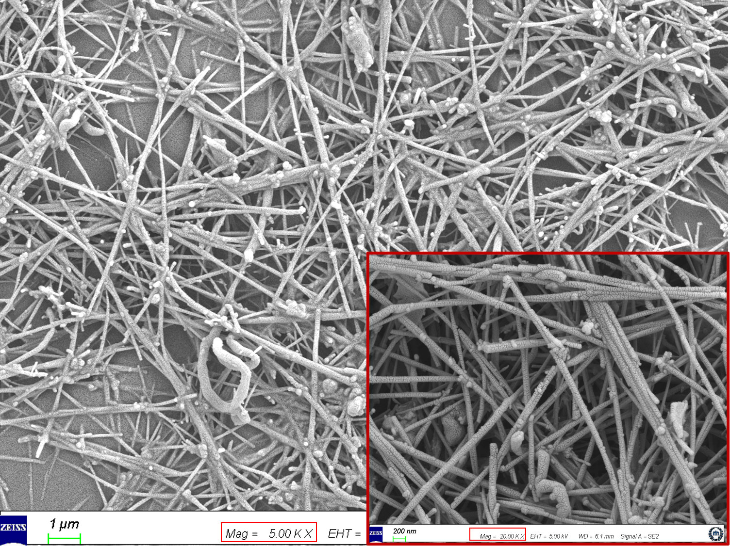 NanoBorNT-80 powder contains 80% of BNNT in weight, while the balance is h-BN with the trace of metallic impurity. NanoBorNT-80 can be used virtually in every industry for IT/IoT, energy and environment, space and nuclear, and even biomedical applications Currently, Naieel Technology can offer kg’s even ton’s of NanoBorNT-80 (please contact us for the industrial supply).